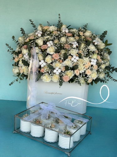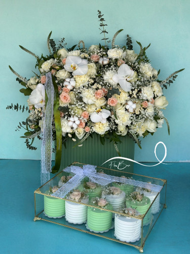باکس گل و کاپ کیک خواستگاری سفید سبز فلوبار