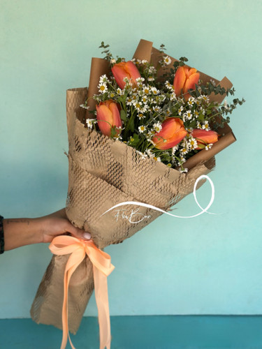 دسته گل لاله نارنجی و بابونه فلوبار