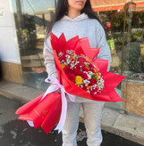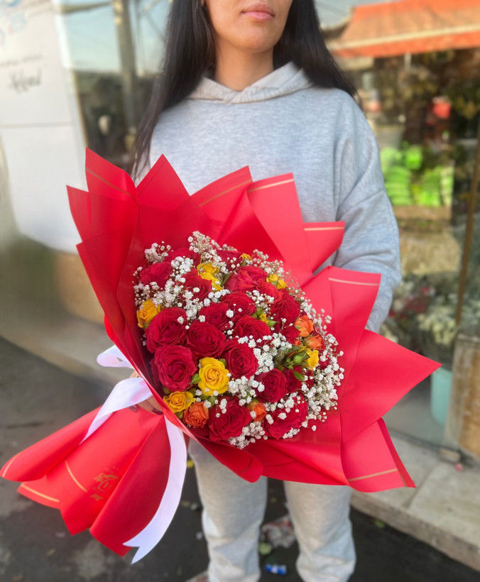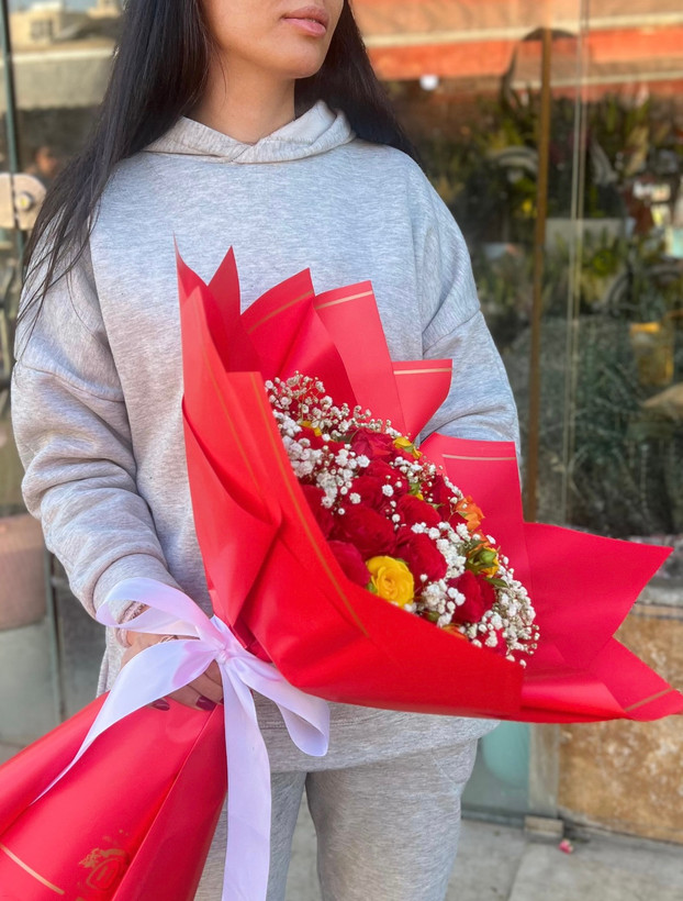 دسته گل با ترکیب گل رز قرمز و رز مینیاتوری زرد و نارنجی❤️🧡💛