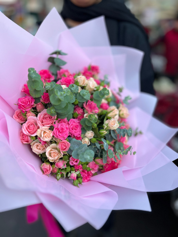 دسته گل با ترکیبی از گلهای رز مینیاتوری و اکالیپتوس😍