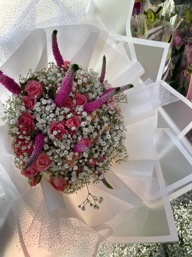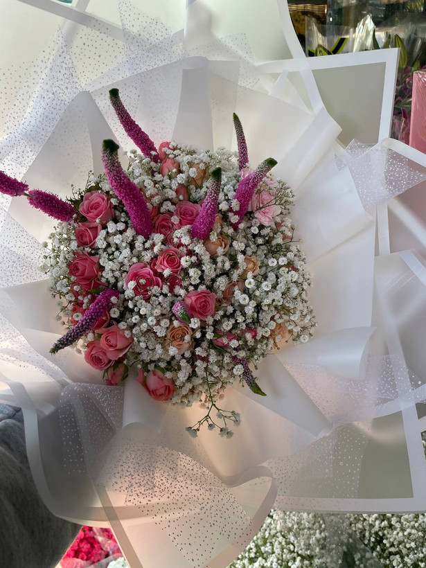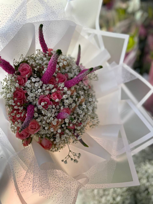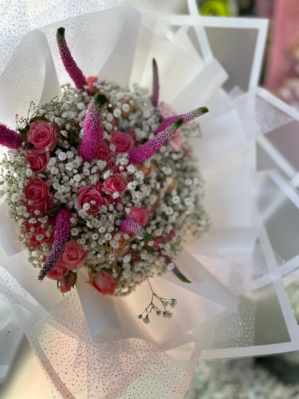 دسته گل با ترکیبی از گلهای رز مینیاتوری، ورونیکا و ژیپسوفیلا🩷🤍