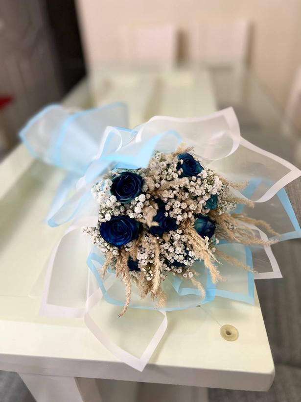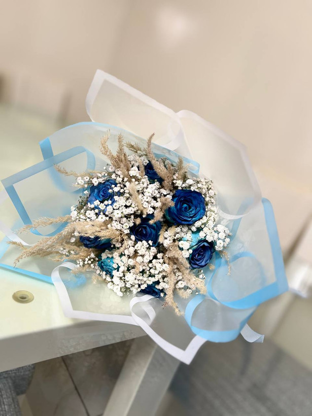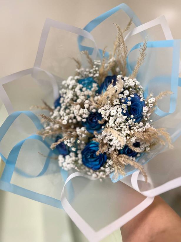 دسته گل رز آبی و ژیپسوفیلا💙🤍