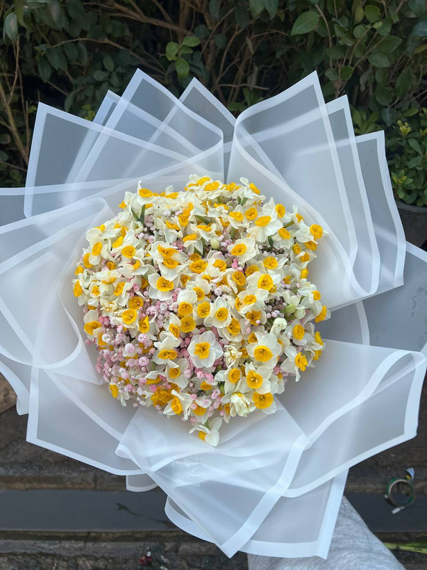 دسته گل نرگس و ژیپسوفیلا صورتی فلوبار