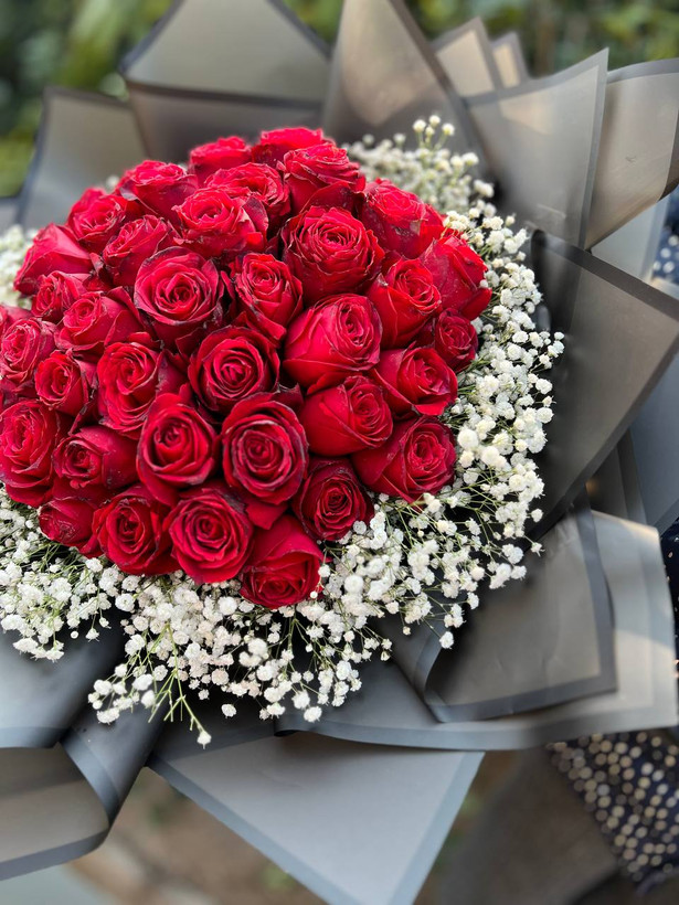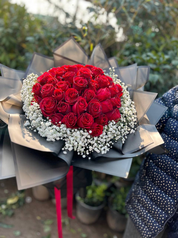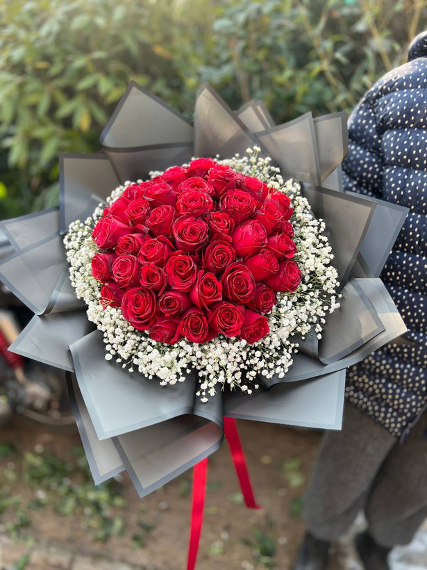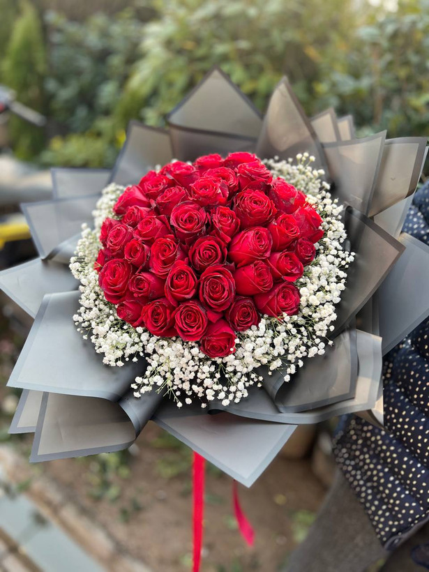 دسته گل ۵۰ شاخه رز قرمز ایرانی به همراه دورچین ژیپسوفیلا❤️🤍