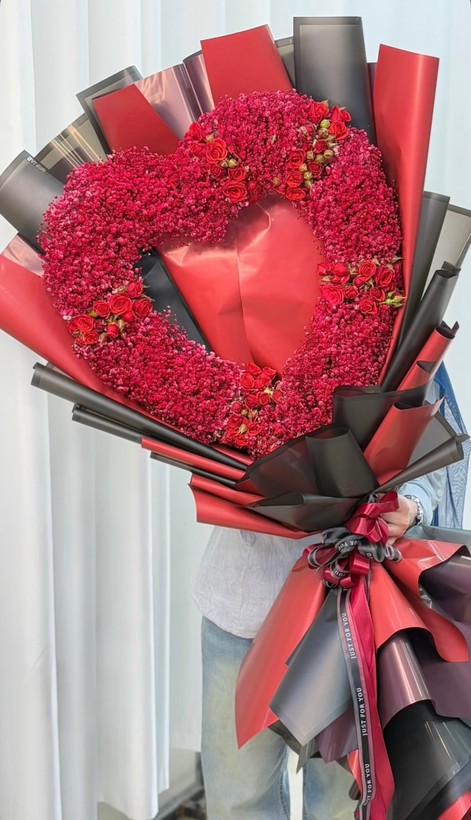 دسته گل قلبی ژیپسوفیلا و رز مینیاتوری قرمز❤️