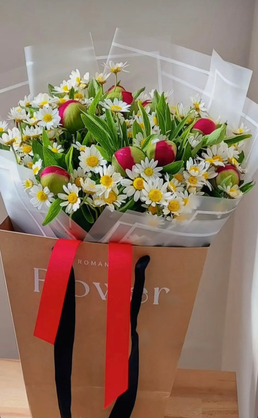 دسته گل ۱۵ شاخه گل پیونی یا گل صدتومنی قرمز ترکیب با گل بابونه❤️💚💛