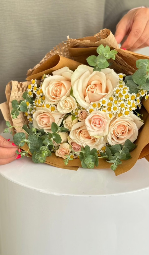 دسته گل رز کالباسی و بابونه🩷💛💚