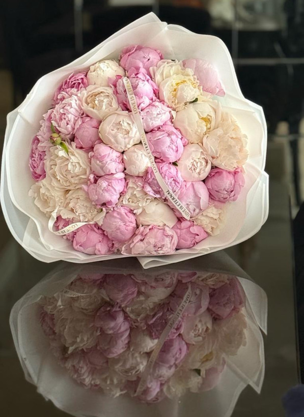 دسته گل ۳۵ شاخه گل پیونی یا گل صدتومنی سفید صورتی🩷🤍