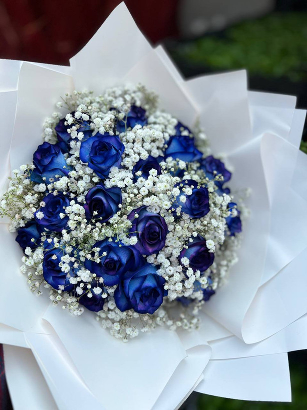 دسته گل ۲۰ شاخه رز آبی و ژیپسوفیلا💙🤍