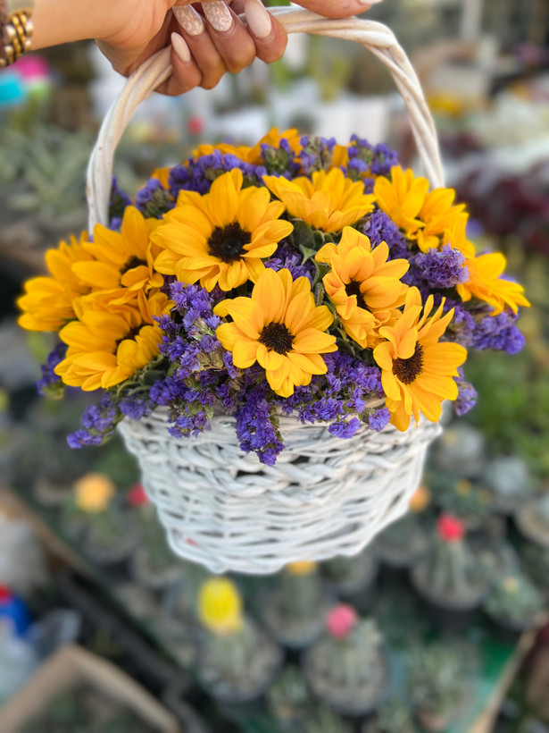 سبد گل جذاب آفتابگردون با زنبوری بنفش💜💛