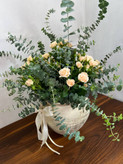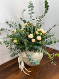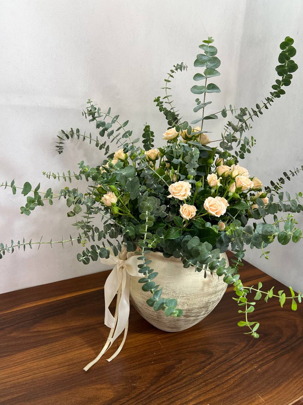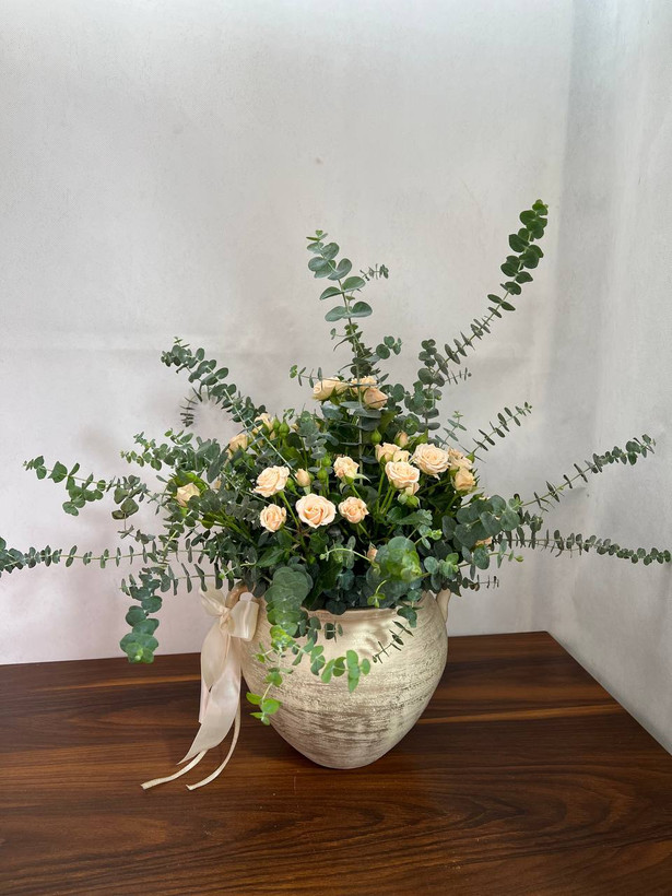 همنشینی گل رز مینیاتوری گلبهی و برگ اکالیپتوس داخل کوزه سفالی آنتیک✨