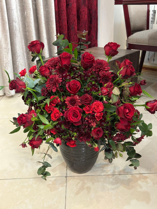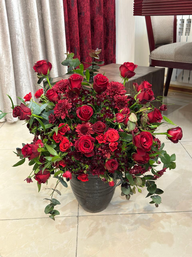 گل رز قرمز دیزاین شده داخل کوزه سفالی آنتیک مشکی🌹
