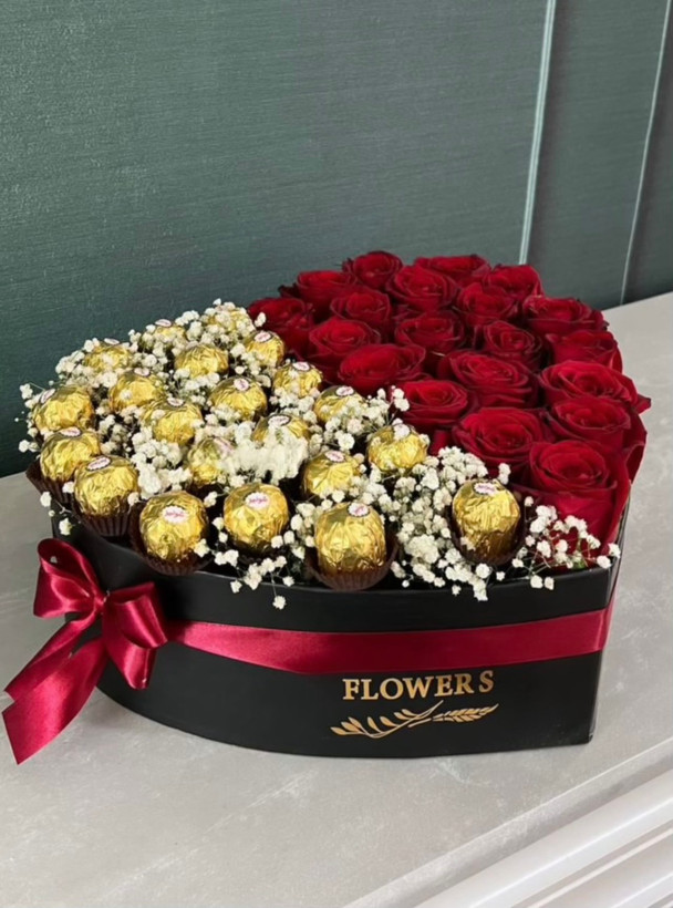 باکس قلبی با گل رز قرمز و شکلات شونیز❤️🖤💛
