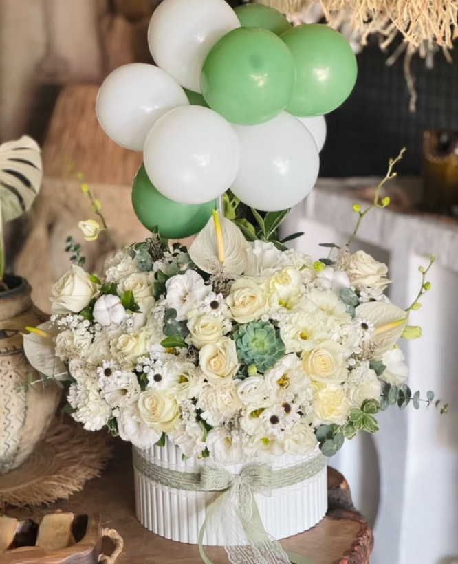 ترکیب گلهای رز هلندی، لیسینتوس، آنتریوم و اکالیپتوس💚