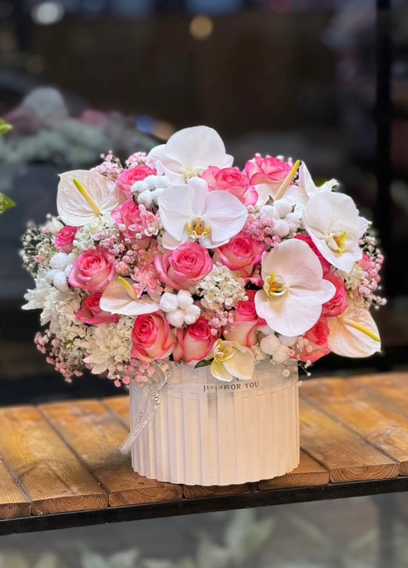 ترکیب گلهای رز لب ماتیکی، آنتریوم، ارکیده، داودی، قلمفور، گل پنبه و ژیپسوفیلا🤍🩷