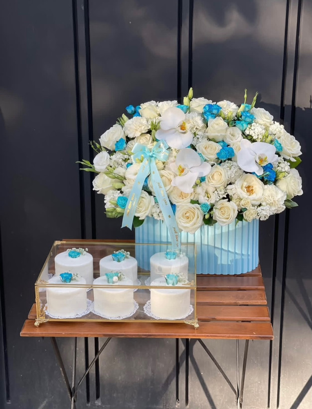✅ باکس گل به همراه گلهای لاکچری سفید و آبی🩵🤍