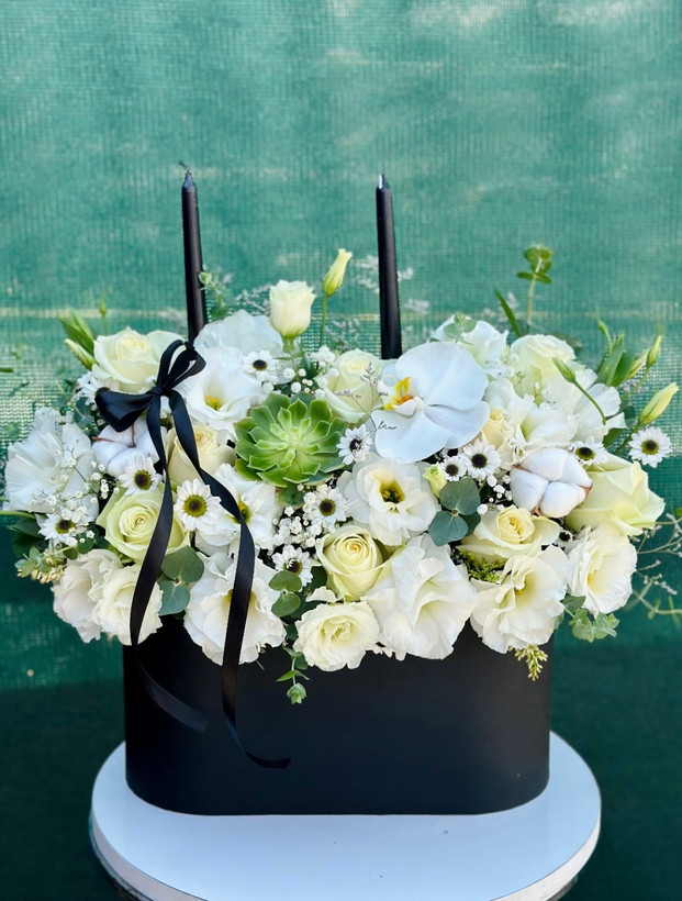 ترکیب گلهای رز، لیسینتوس، ارکیده، داودی، ژیپسوفیلا و اکالیپتوس🖤🤍
