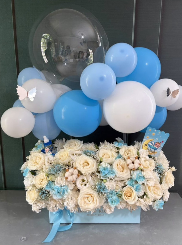 باکس گل و بادکنک و عروسک نوزادی پسرونه فلوبار