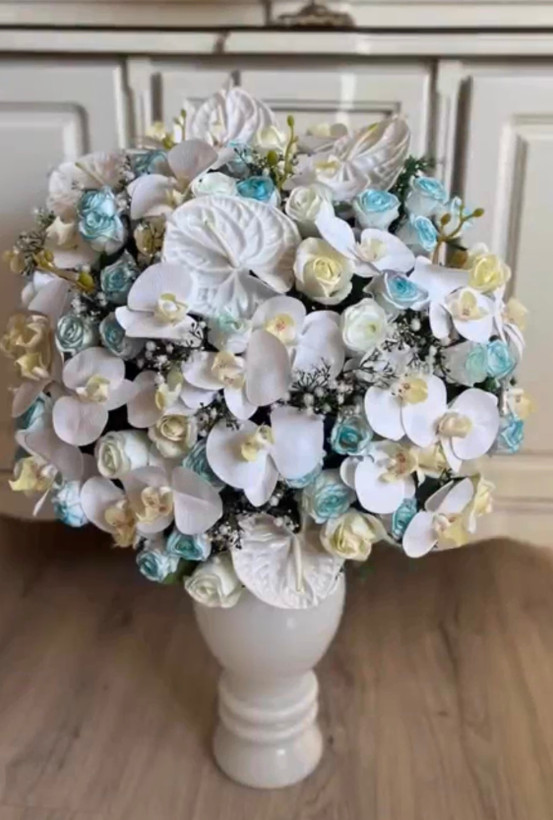 تم آبی ملیح، حس لطافت، آرامش و وقار را القا میکند. این رنگ معمولاً در ترکیب با سفید، کرم یا صدفی به کار میرود تا فضای کار بیشتر لطیف و مجلسی شود. از گلهایی مثل رز مصنوعی آبی روشن، آنتریوم، ارکیده و ژیپسوفیلا برای تکمیل کار استفاده میشود.