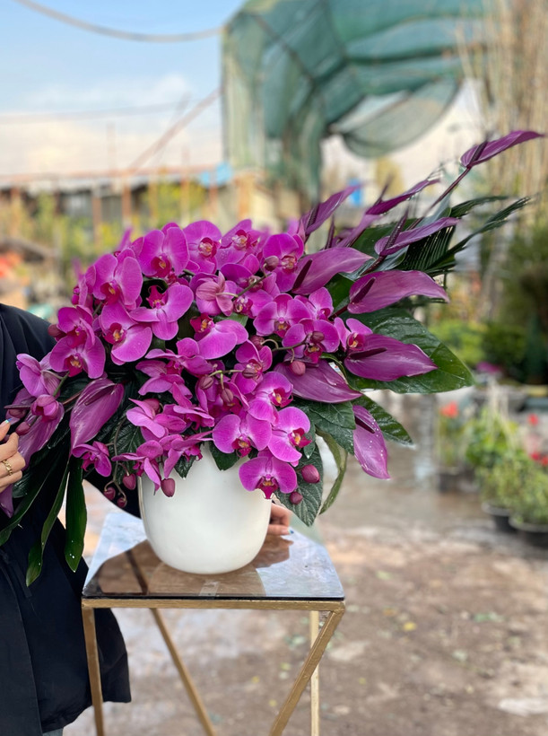 گلدان سرامیکی سفید دیزاین شده با آنتریوم و ارکیده شاخه ای بنفش💜🤍
