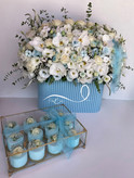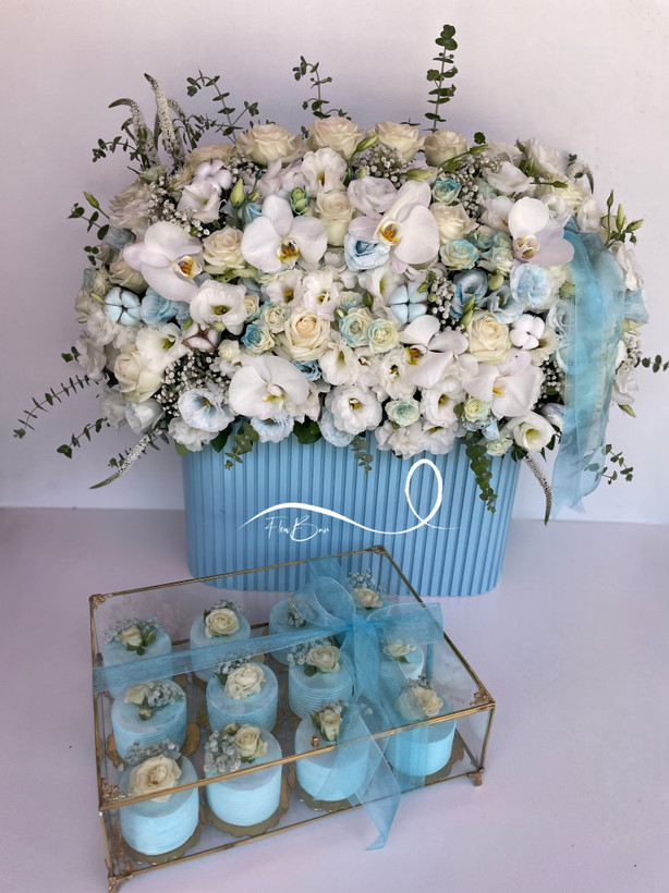 باکس گل و کاپ کیک خواستگاری سفید آبی فلوبار