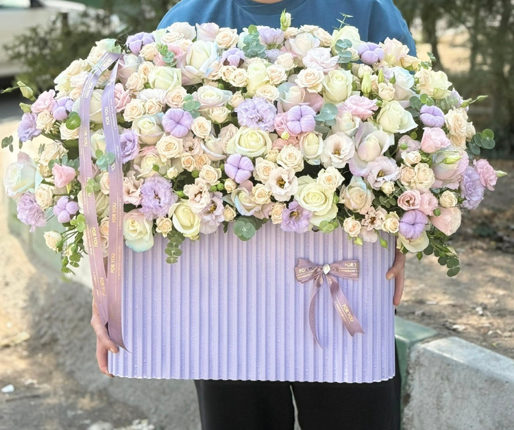 باکس گل لاکچری با تم رنگی لایت و ملایم، ترکیبی از گلهای رز کرم، رز هلویی، لیسیانتوس بنفش روشن، میخک و شکوفههای فانتزی به رنگهای صورتی و بنفش، در یک باکس مستطیلی بزرگ با جنس پی وی سی ضدآب بنفش روشن ارائه شده است. این باکس گل بسیار شیک و خاص برای مناسبتهایی مانند تبریک تولد، سالگرد ازدواج، مراسم رسمی، تقدیر و تشکر و همچنین سورپرایز عزیزان بسیار مناسب است.
