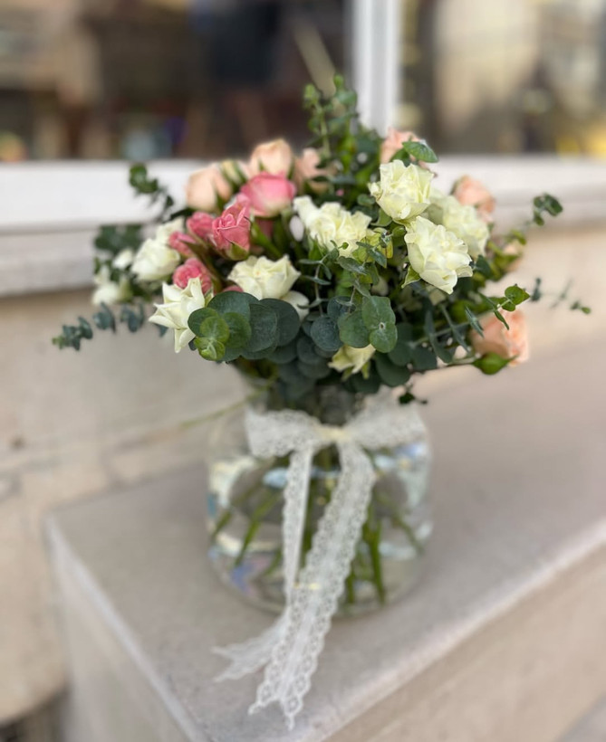 گل رز مینیاتوری سفید و صورتی داخل جار گل فلوبار