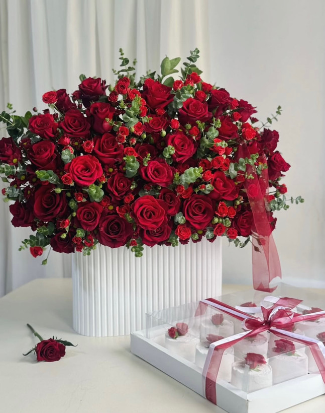 باکس گل و کاپ کیک خواستگاری سفید قرمز فلوبار
