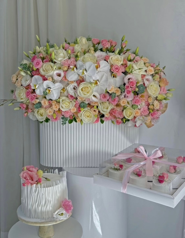 باکس گل و کاپ کیک خواستگاری سفید صورتی فلوبار