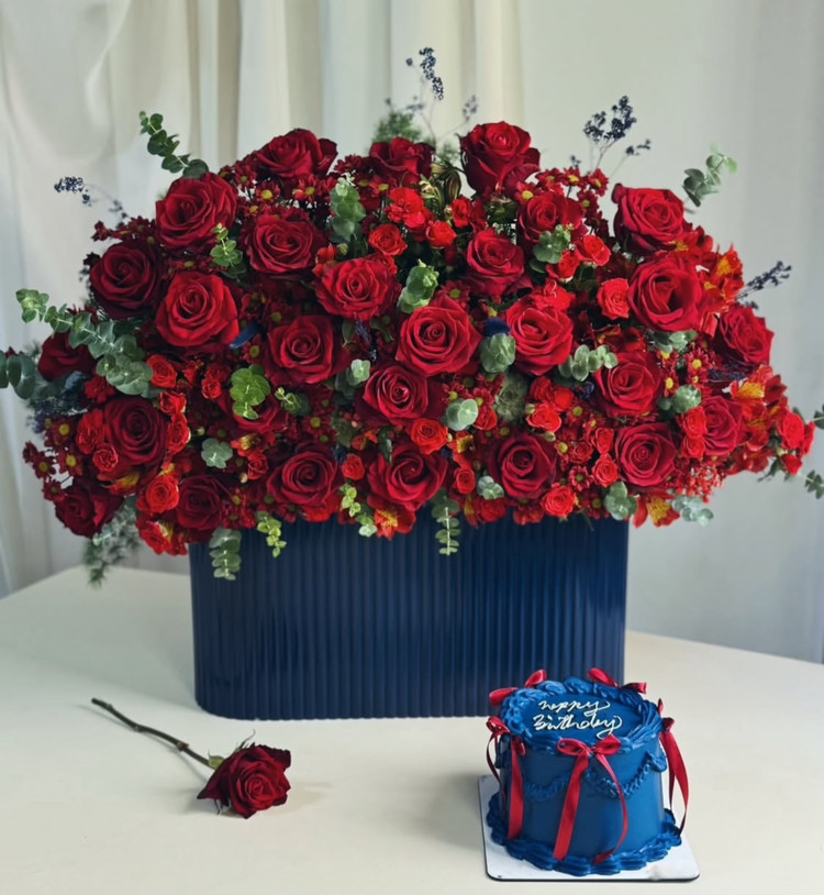 پک گل و کیک تولد با تم قرمز و سرمه ای❤️💙