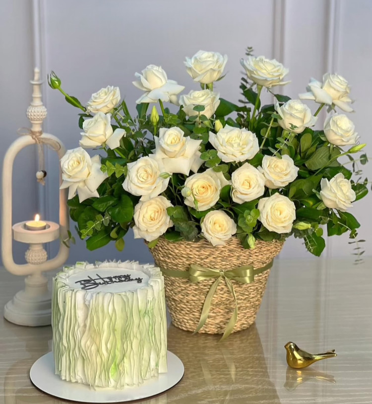 پک گل و کیک تولد با تم سبز و کرم🤎💚