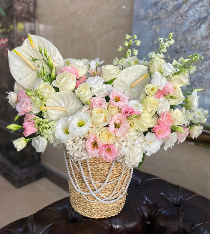 ترکیبی از گلهای رز هلندی، آنتریوم، لیسینتوس و هورتانسیا✨
