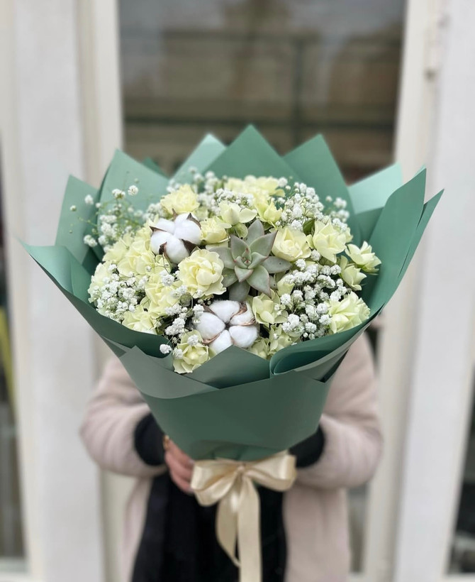 دسته گل رز مینیاتوری و ژیپسوفیلا🤍💚