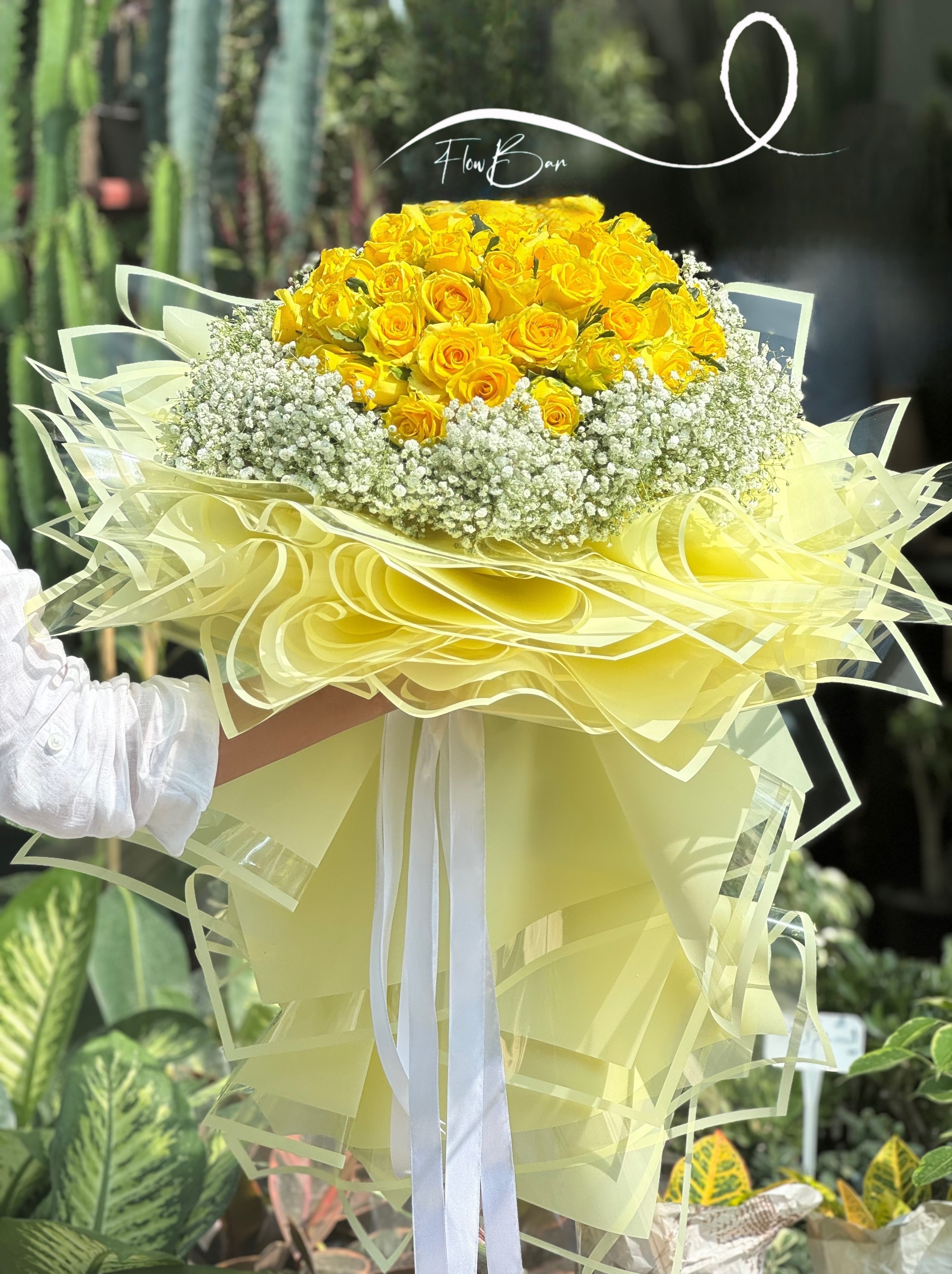 دسته گل ۶۰ شاخه رز زرد به همراه ژیپسوفیلا💛