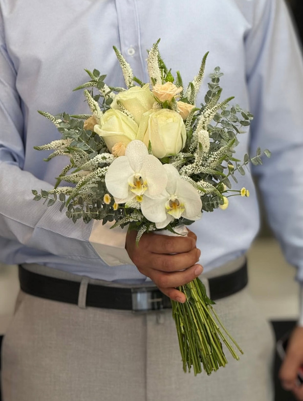 دسته گل عروس با رز سفید و ژیپسوفیلا، ترکیبی کلاسیک و رویایی برای مراسم عروسی. رز سفید نماد عشق پاک و شروعی تازه است و در کنار ژیپسوفیلا (baby’s breath) با شکوفههای ظریف و ابریشکل، ظاهری لطیف و رمانتیک به دستهگل میبخشد. این دسته گل عروس انتخابی شیک، مینیمال و همیشگی برای عروسهایی است که به دنبال سادگی در عین زیبایی هستند. استفاده از گلهای تازه و طبیعی در طراحی این دسته گل، حس طراوت و ظرافت خاصی را به روز عروسی شما هدیه میدهد.