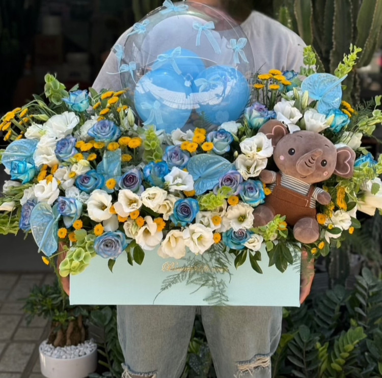 ‎باکس گل و بادکنک و عروسک نوزادی پسرونه فلوبار