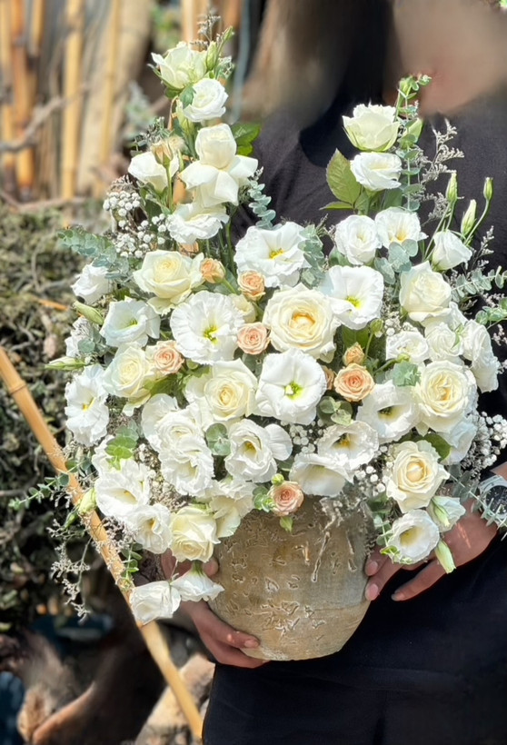 همنشینی گل های سفید و گلبهی و برگ اکالیپتوس داخل کوزه سفالی آنتیک✨