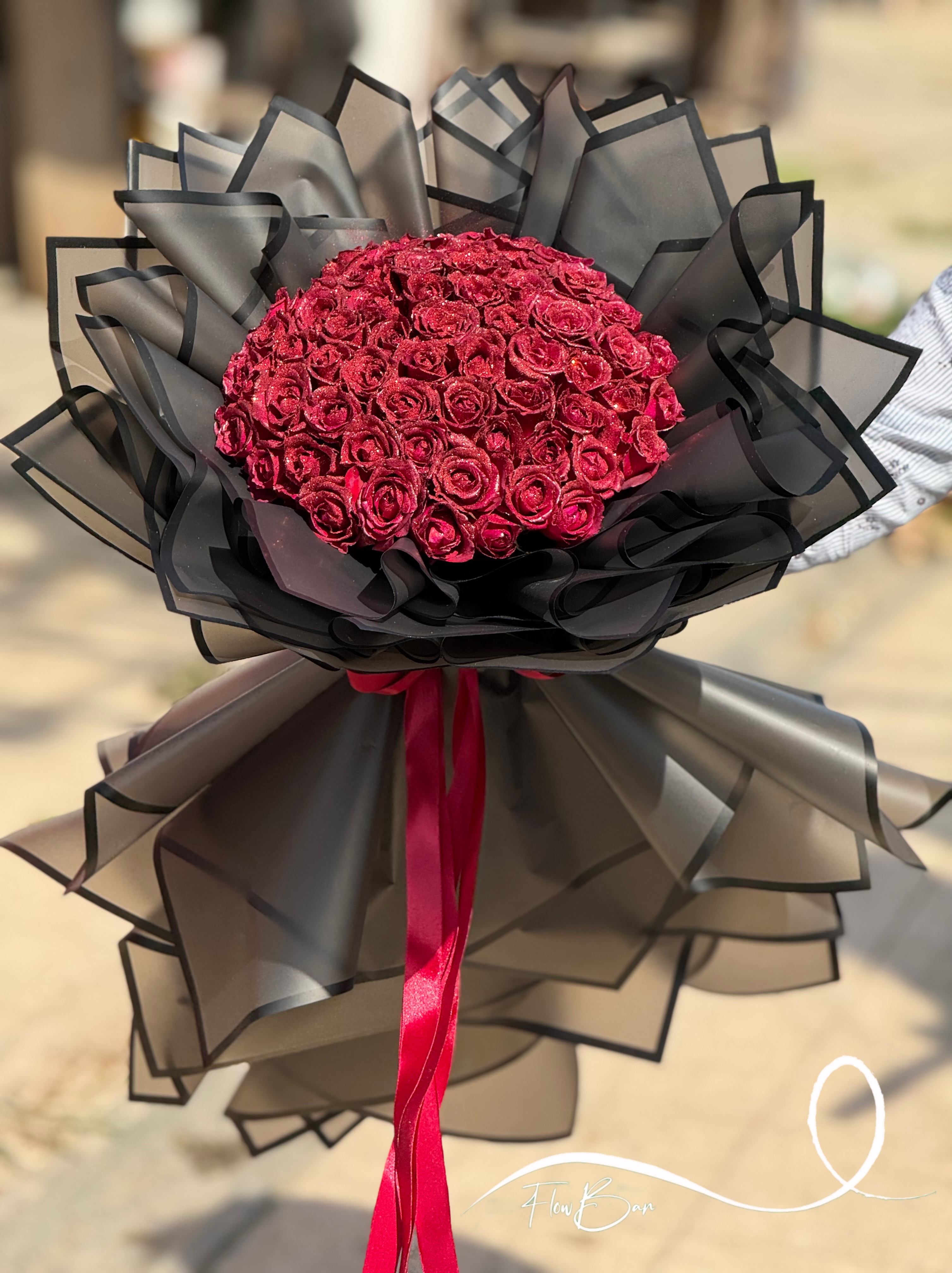 دسته گل ۶۰ شاخه رز قرمز شاین دار فلوبار