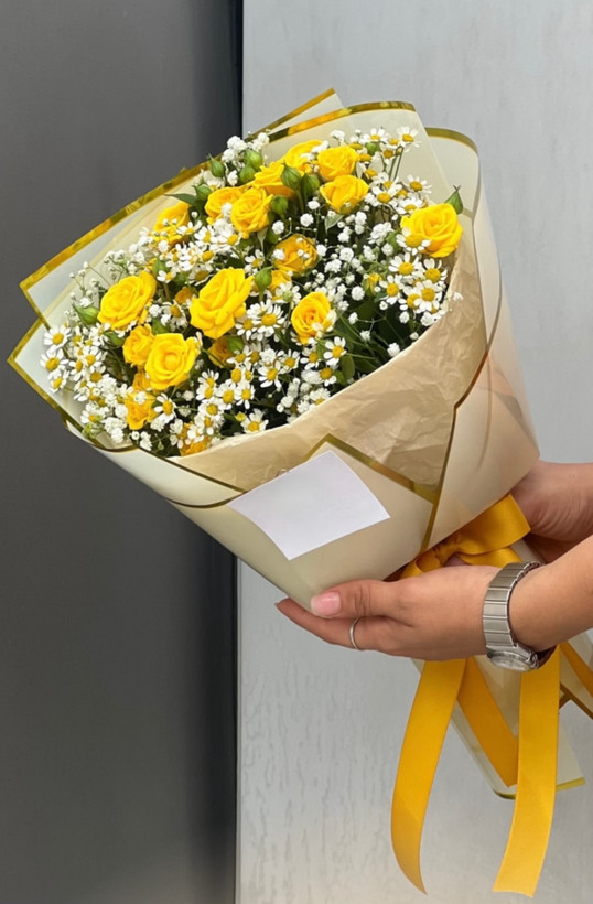 دسته گل رز مینیاتوری زرد و بابونه💛