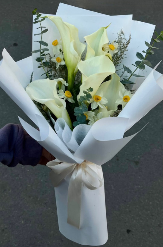 دسته گل نرگس و شیپوری سفید💚💛🤍