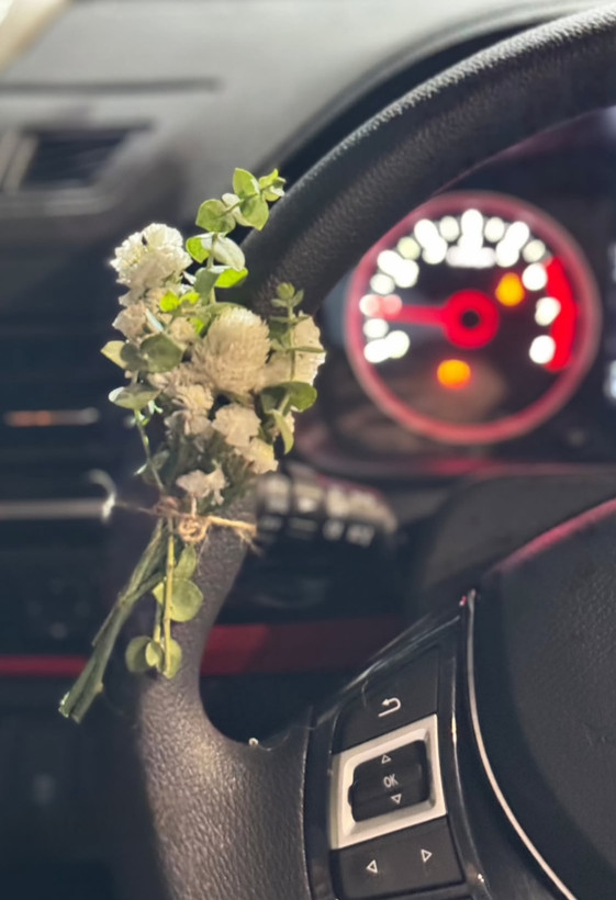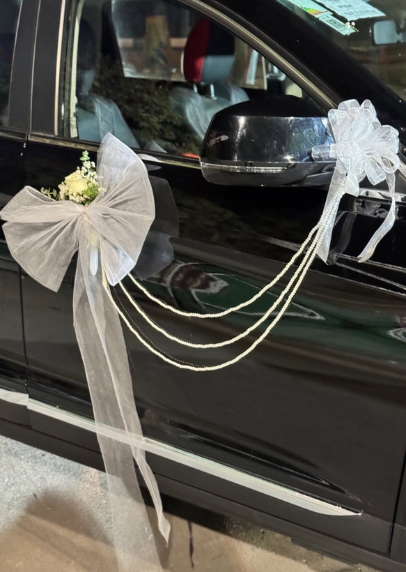 بستن روبان سفید، نباتی یا همرنگ گلها دور آینه بغل، در کنار گلها، جلوه رمانتیک و زیبایی ایجاد میکند. میتوان روبان را بهصورت آویزان یا پاپیون ساده طراحی کرد.