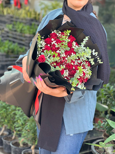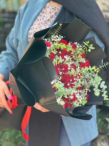 ۴۰ شاخه رز قرمز با ژیپسوفیلا و اکالیپتوس