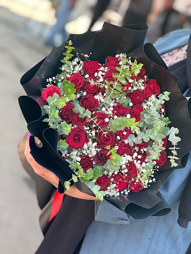 دسته گل ۴۰ شاخه رز قرمز فلوبار