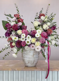 چیدمان گل های رز و لیسینتوس داخل کوزه سفالی آنتیک✨