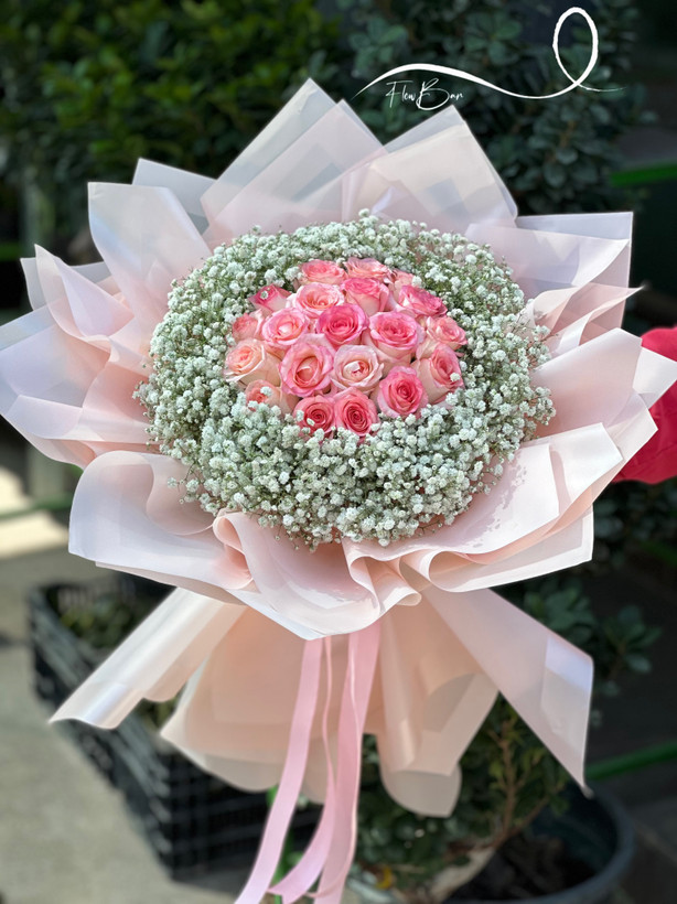 دسته گل ۲۰ شاخه رز لب ماتیکی صورتی به همراه ژیپسوفیلا🌸