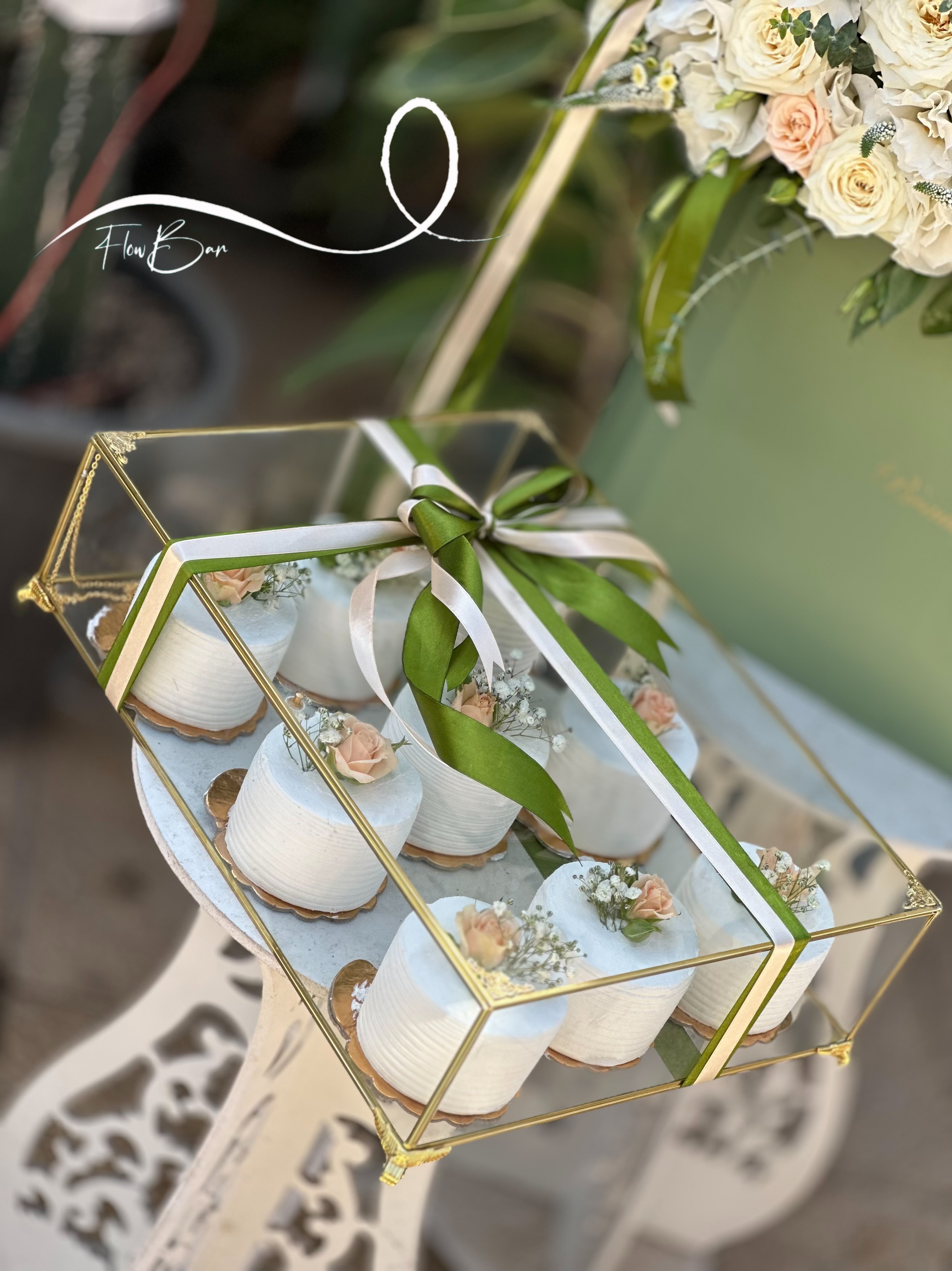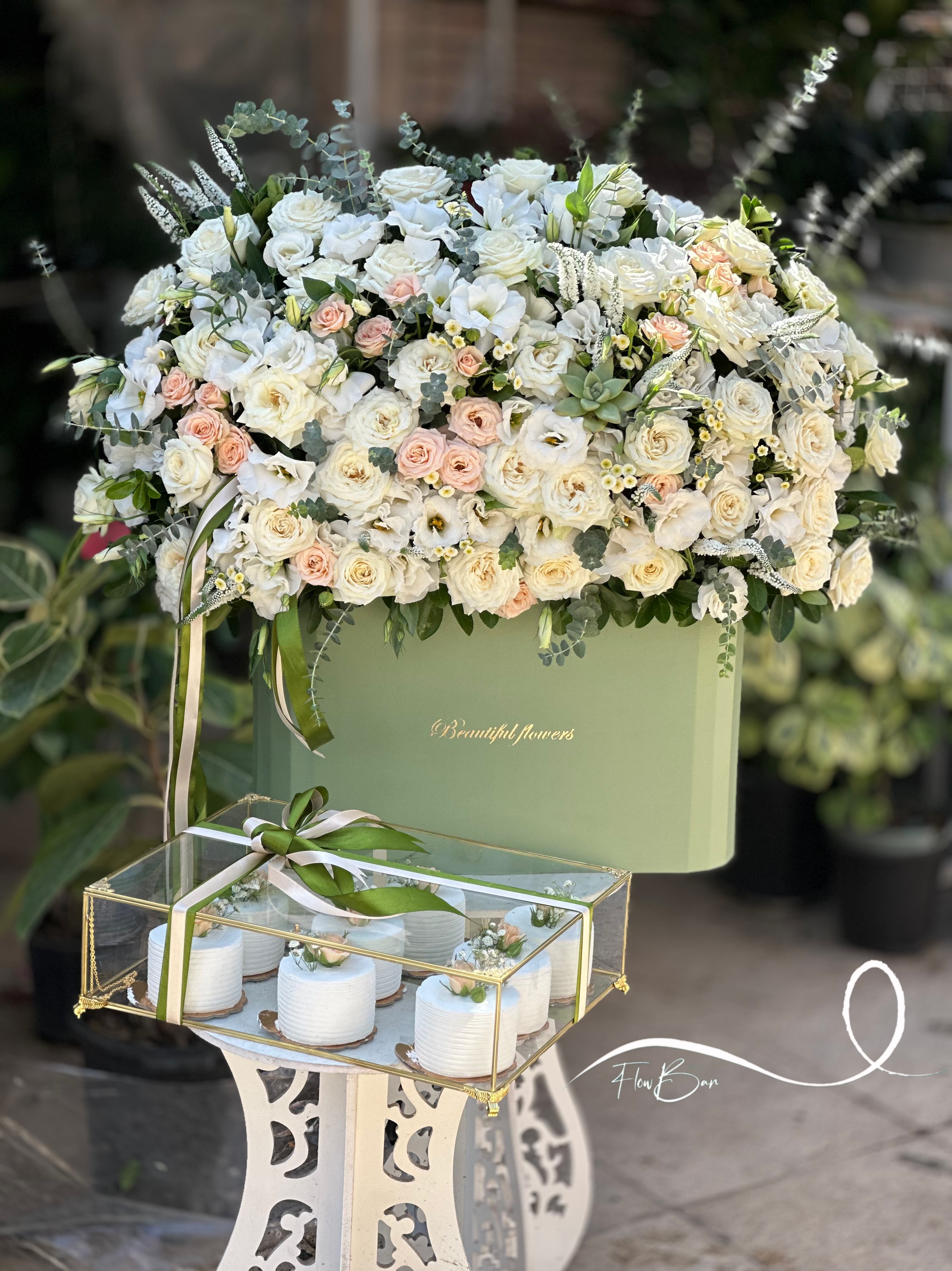 باکس گل و کاپ کیک خواستگاری سبز و گلبهی فلوبار