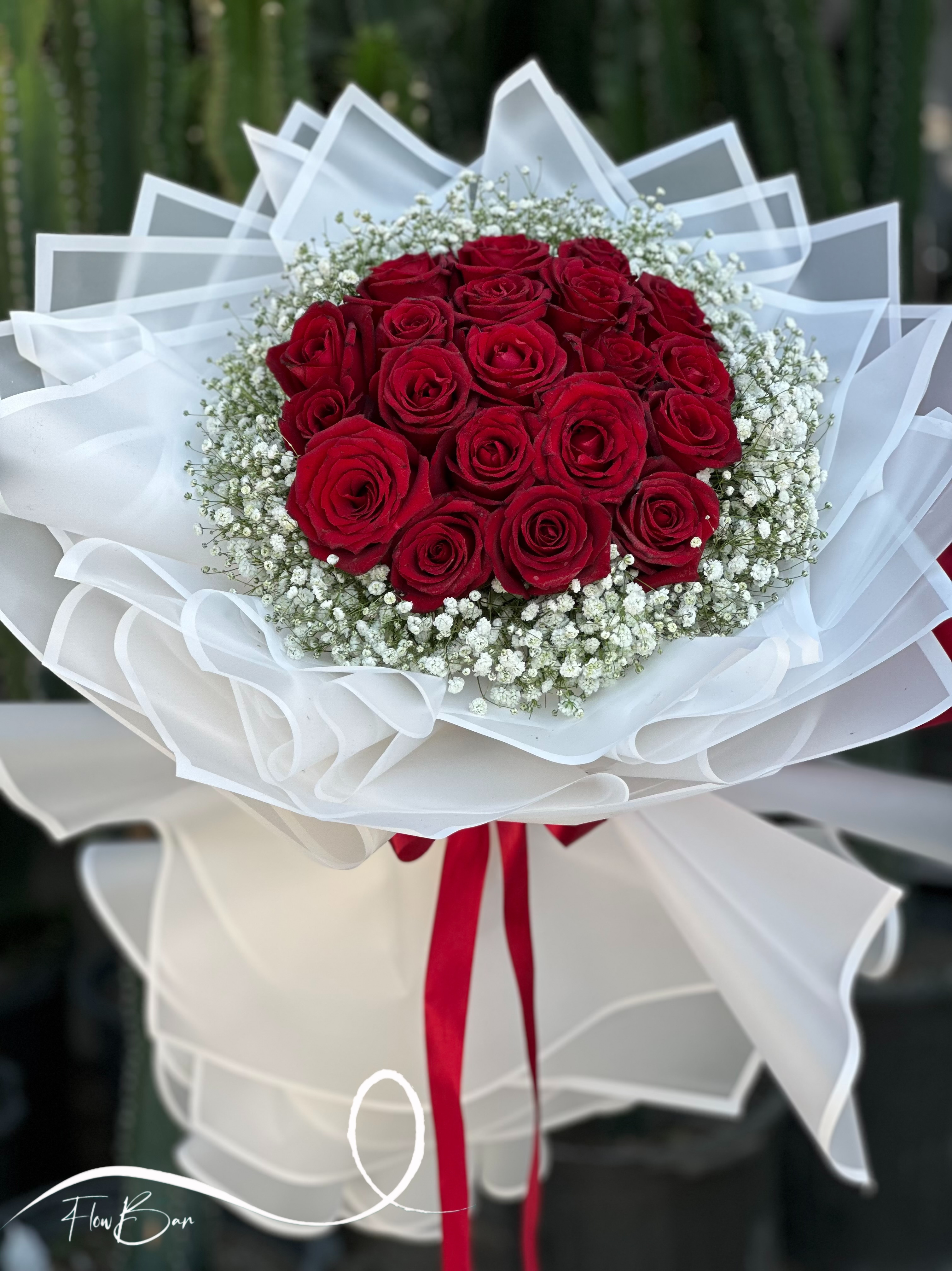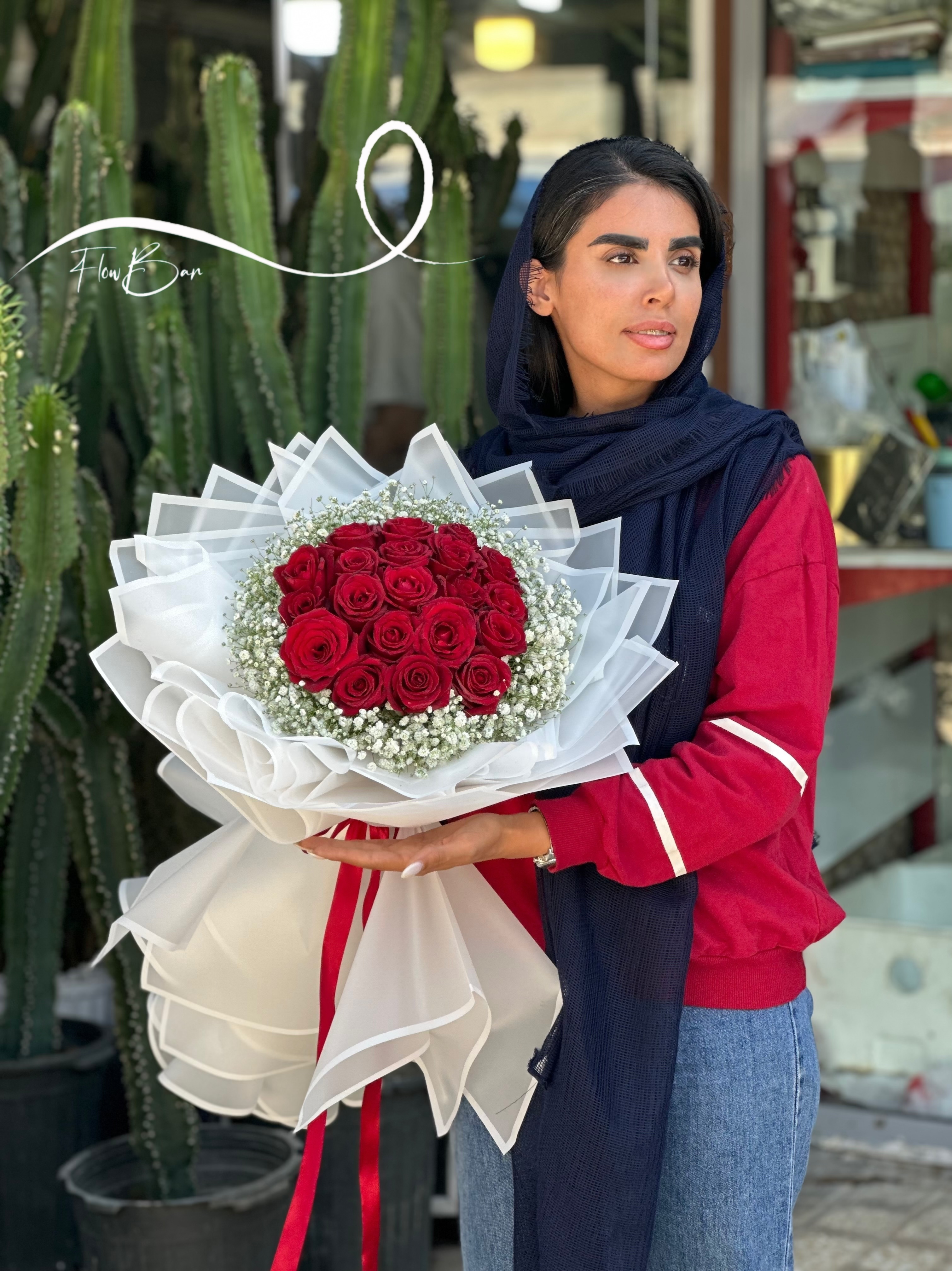 دسته گل ۲۰ شاخه رز قرمز به همراه ژیپسوفیلا❤️
