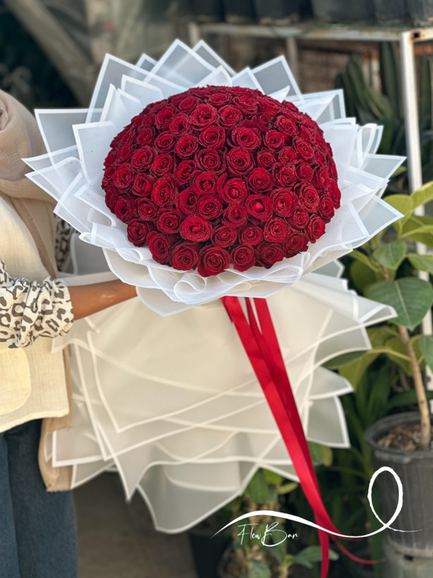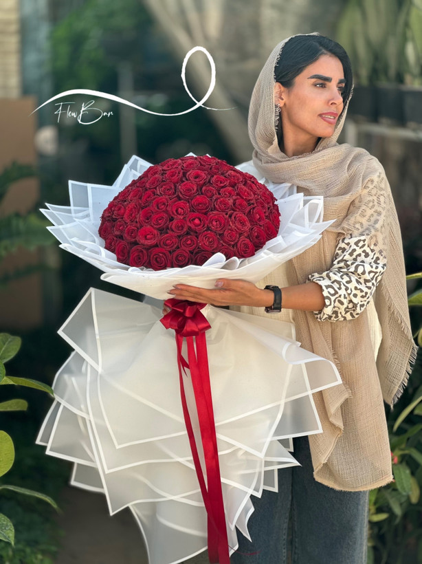 دسته گل ۱۰۰ شاخه رز قرمز شایندار فلوبار