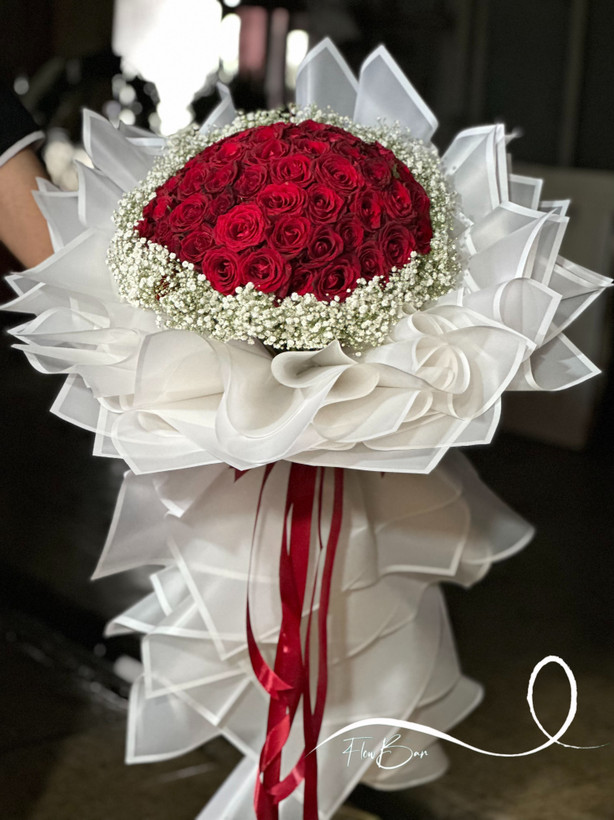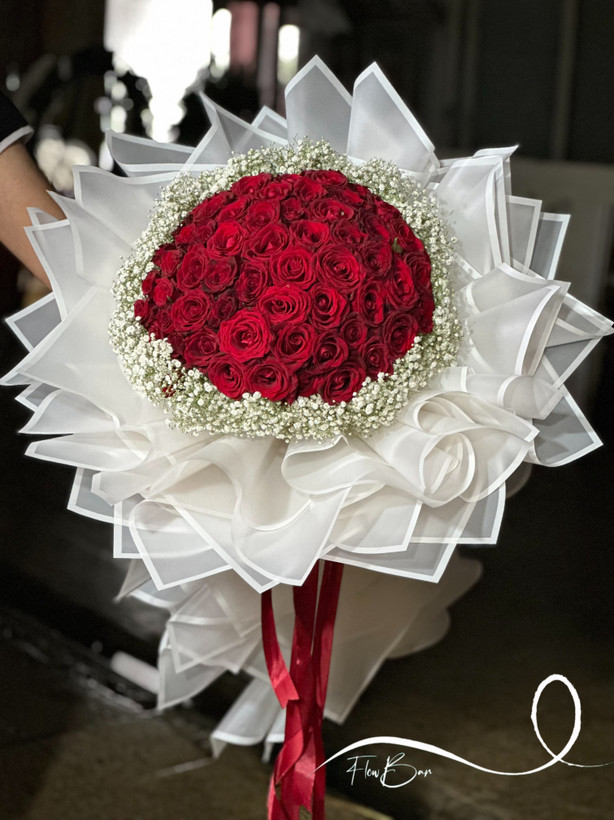 دسته گل ۶۰ شاخه رز قرمز با دورچین ژیپسوفیلا🤍❤️