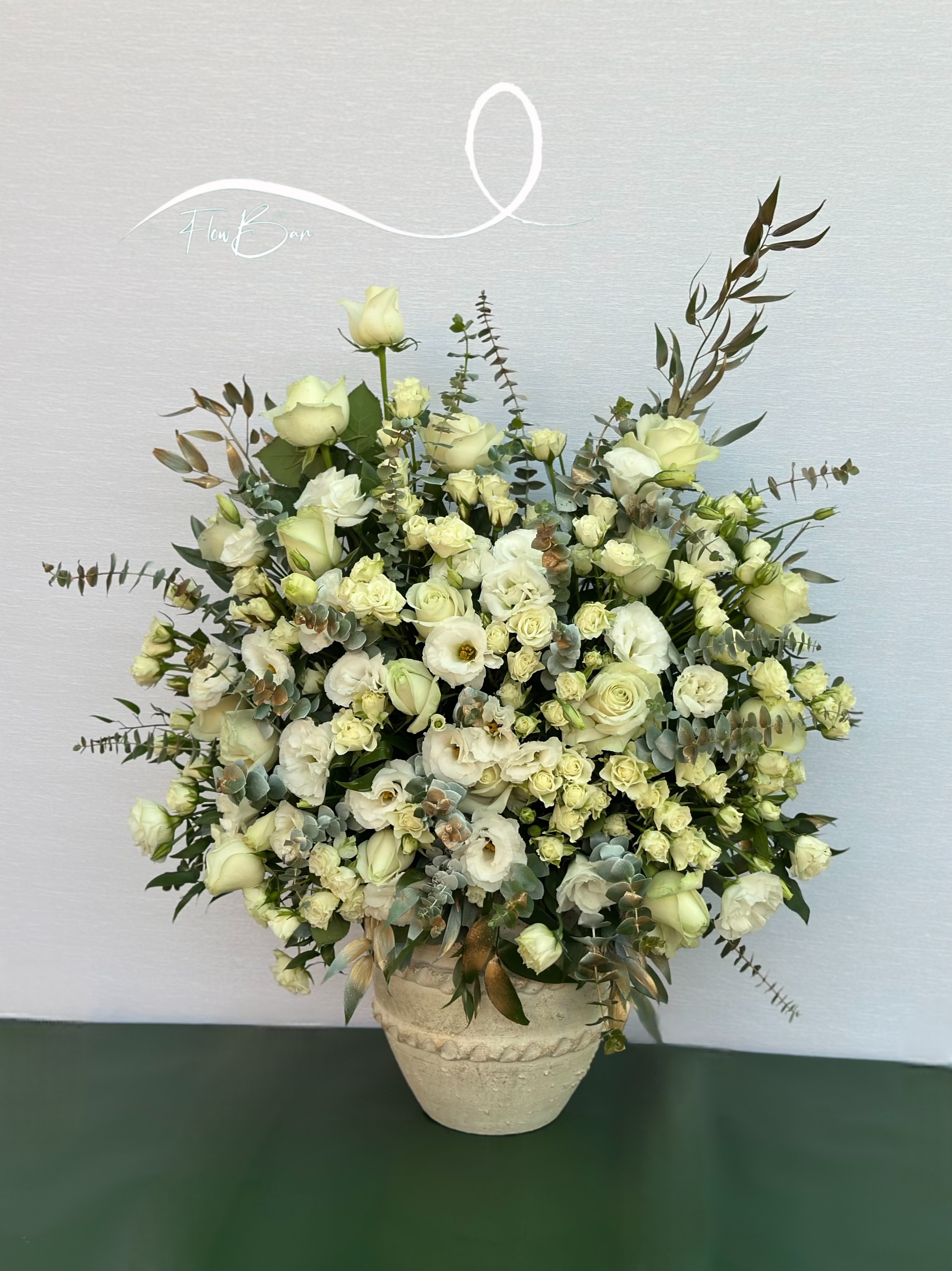 چیدمان گل های رز و لیسینتوس داخل کوزه سفالی آنتیک✨